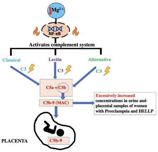 Although the etiology of the disease is not thoroughly studied, it is thought to be due to a systemic inflammatory disorder that is mediated by a complement cascade. It is postulated that the pathogenesis of HELLP syndrome is like that of pre-eclampsia due to poor placentation leading to increased activation of the complement system. Ultimately, the patient suffers from increased hepatic inflammation and hemolysis and elevated liver enzymes [45,47]. Complement cascade of pre-eclampsia and HELLP with added integration of low Mg2+ levels lead to activation of NF-κB, which in turns activates the complement, as illustrated in Figure 6 [1,45].
