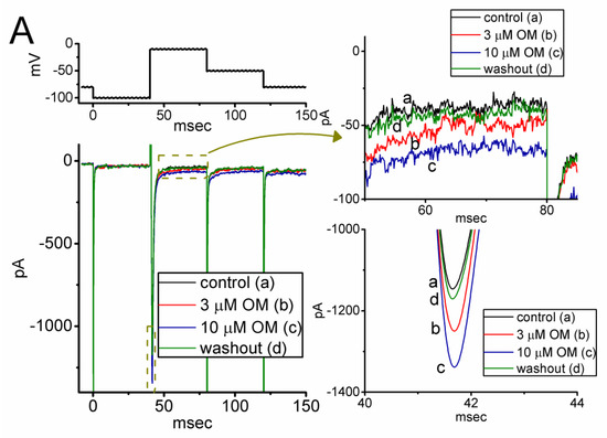 Another set of measurements was conducted to determine whether exposure to OM could alter the magnitude of K+ currents, specifically IK(DR), in GH3 cells. The cells were maintained in Ca2+-free, Tyrode’s solution containing 1 µM TTX and 0.5 mM CdCl2, while the recording electrode was filled with a K+-containing solution. The mean I–V relationship of IK(DR) was then recorded in the presence and absence of OM, and the results are presented in Figure 7. The presence of 10 µM OM was noticed to produce a slight reduction in the IK(DR) amplitude. For example, with cell exposure to 10 µM OM, the IK(DR) amplitude measured at the level of +50 mV was significantly decreased to 540 ± 57 pA (n = 7, p < 0.05) from a control value of 721 ± 69 pA (n = 7), while for those at 0 mV, the IK(DR) amplitude was reduced from 219 ± 33 pA (n = 7) to 164 ± 30 pA (n = 7, p < 0.05) upon cell exposure to 10 µM OM. After the washout of the compound, the current amplitude was returned to 718 ± 65 pA (n = 7). Conversely, no measurable change in the inactivation time course of IK(DR) was observed by adding OM. The data suggest that cell exposure to OM leads to a mild suppression of the IK(DR) present in GH3 cells.