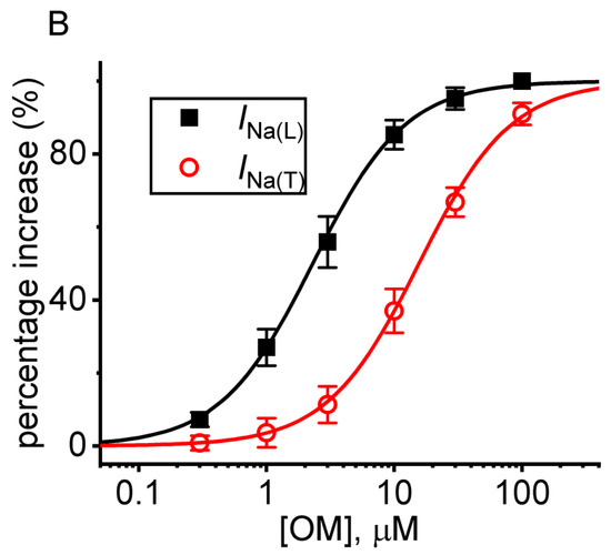 where [OM] is the OM concentration given, EC50 and nH represent the half-maximal concentration of OM and the Hill coefficient, respectively, and Emax is the maximal activation of INa(T) or INa(L) caused by the OM presence.