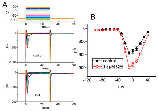 To investigate the stimulatory effect of OM on INa, we examined whether this compound affected the steady I–V relationship of INa in GH3 cells. For these measurements, cells were clamped at −80 mV, and a series of voltages ranging from −100 to +40 mV in 10-mV steps for a duration of 30 ms was applied to evoke INa. We then assessed whether OM exerted any perturbations on the I–V relationship of INa. Figure 2A shows a representative current trace at different levels of membrane potentials, and Figure 2B depicts the mean I–V relationships of INa(T) obtained with or without exposure to 10 µM OM. The results indicate that no obvious change in the overall steady-state I–V relationship of INa(T) was observed during cell exposure to OM.