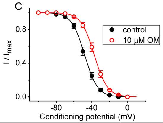 To determine the quasi-steady-state inactivation curve of INa(T) in the presence or absence of 10 µM OM, we employed a two-step voltage-clamp protocol on the cells under examination. The measurements involved applying a 30 ms conditioning potential to a series of voltages ranging from −100 to 0 mV, following a holding potential of −100 mV, before a 30 ms test pulse from −80 to −10 mV from a holding potential of −100 mV was applied to precede a 30 ms test pulse from −80 to −10 mV. The time interval between the two sets of voltage pulses was approximately 2 min to ensure the complete recovery of INa evoked by the rapid depolarizing step. We constructed the relationships between the conditioning potentials and the normalized amplitude (I/Imax) with the absence or presence of 10 µM OM by fitting the dataset to a modified Boltzmann function—that is,