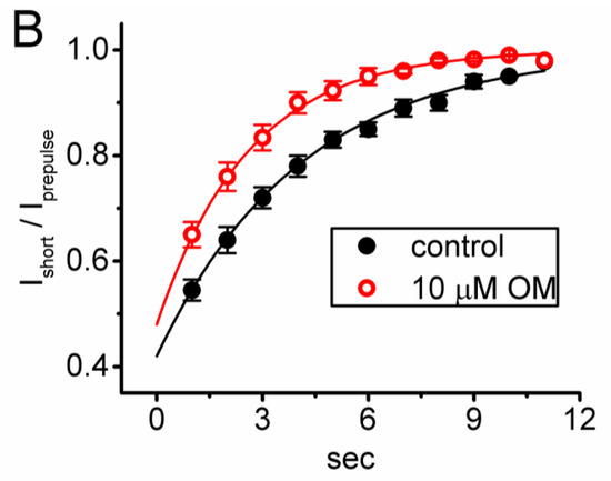 Effect of OM on the time course of recovery from INa inactivation activated by a depolarization step from −80 to −10 mV for a duration of 10 s (prepulse). Following the 10 s prepulse, the recovery time course of the current amplitude was consecutively measured during a 30 ms depolarizing step from −80 to −10 mV with a rate of 1 Hz. (A) Representative current trace obtained in the control period. The uppermost part (indicated in blue color) depicts the voltage pulse protocol given, while the lower part shows the display of an expanded record in a red broken box with a red curve arrow appearing in the upper part. The asterisks marked in the lower part indicate a progressive increase in the INa(T) amplitude (i.e., recovery time course). (B) The relationship of the relative amplitude of INa versus the stimulus duration achieved without (black filled circles) and with (red open circles) the presence of 10 µM OM (mean ± SEM; n = 8 for each red or black point). The relative amplitude (i.e., Ishort/Iprepulse) appearing at the y axis was the ratio of the INa(T) amplitude during a short 30 ms depolarizing pulse at different times (i.e., with a stimulus rate of 1 Hz) and that activated during a 10 s prepulse from −80 to −10 mV. Notably, the presence of OM produced a clear shortening in the recovery time course of INa(T) inactivation taken after a 10 s prepulse depolarization. Each black asterisk on the graph represents the occurrence of a transient Na+ current.