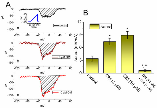 In recent studies, the instantaneous INa(W) current has been shown to be detectable during the short duration of an upwardly sloping (or ascending) ramp voltage (Vramp) in various excitable cells [23,28,29]. In this study, we investigated whether the presence of OM could alter the amplitude of the non-linear INa(W) that is elicited by a brief, upwardly sloping Vramp. To perform this separate set of experiments, we clamped the tested cell at −80 mV and applied an ascending Vramp from −100 to +50 mV for a duration of 100 ms (i.e., with a ramp speed of 1.5 mV/ms) to activate the instantaneous INa(W). As shown in Figure 5, within one minute of exposing GH3 cells to 10 µM OM, the strength (i.e., Δarea) of INa(W) activated by the 100 ms upsloping Vramp was markedly increased. For example, treating cells with OM at a concentration of 3 or 10 µM resulted in a significant increase in INa(W)’s Δarea to 7.4 ± 0.8 mV·nA (n = 8, p < 0.05) or 8.9 ± 0.9 mV·nA (n = 8, p < 0.05), respectively, from a control value of 3.4 ± 0.6 mV·nA (n = 8). Additionally, when cells were continuously exposed to 10 mM OM, the further addition of 1 µM TTX effectively suppressed the Δarea of INa(W) to 0.6 ± 0.2 mV·nA (n = 8, p < 0.05). Based on these experimental observations, it is evident that the presence of OM can increase the strength of INa(W) that is activated by the ascending Vramp.