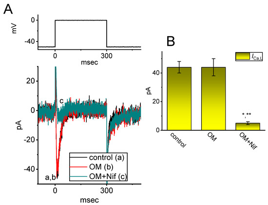 The failure of the OM effect on the L-type Ca2+ current (ICa,L) identified in GH3 cells. These experiments were conducted in cells kept in normal Tyrode’s solution containing 1.8 mM CaCl2, 1 µM tetrodotoxin (TTX), and 10 mM tetraethylammonium chloride (TEA), and the recording electrode was filled up with a Cs+-enriched solution. (A) Representative ICa,L traces obtained in the control period (a) and with cell exposure to 10 µM OM (b) or 10 µM OM plus 1 µM nifedipine (Nif) (c). The voltage protocol given is illustrated atop current traces. (B) Summary bar graph demonstrating the effect of OM (10 µM) and OM (10 µM) plus Nif (1 µM) on the amplitude of ICa,L (mean ± SEM; n = 8 for each yellow bar). The peak amplitude of ICa,L was taken at the onset of the depolarizing step from −50 to 0 mV for a duration of 300 ms. * Significantly different from the control (p < 0.05); ** significantly different from the OM (10 µM) −alone group (p < 0.05).