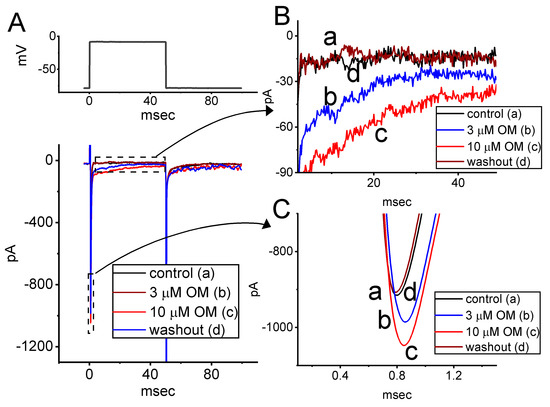 Stimulatory effect of OM on INa recorded from neuroblastoma Neuro-2a cells. We conducted this set of measurements in cells placed into Ca2+-free, Tyrode’s solution, and the electrode was then filled up with Cs+-enriched solution. (A) Representative current traces obtained in the control period (a), with cell exposure to 3 µM OM (b) or 10 µM OM (c), and washout of the compound (d). The voltage pulse protocol applied is indicated in the upper part. In (B,C), the expanded records from each broken box with a curve arrow are illustrated, respectively.