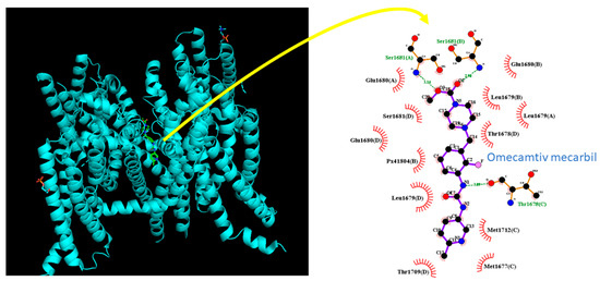 In this study, we used molecular docking analysis with PyRx software to investigate the potential binding of OM to the hNaV1.7 channel protein, based on the crystal structure of hNaV1.7 obtained from the RCB PDB (ID: 5EK0). The predicted docking sites of OM with amino-acid residues are presented in Figure 9. Notably, the OM molecule may form hydrophobic contacts with Met1677(C), Thr1678(D), Leu1679(A), Leu1679(D), Glu1680(A), Glu1680(B), Gllu1680(D), Ser1681(D), Thr1709(D), Met1712(C), and Px41804(B). Moreover, the OM molecule was found to form hydrogen bonds with Thr1678(C), Ser1681(A), or Ser1681(B) with distances of 3.09, 3.14, or 2.98 Å.