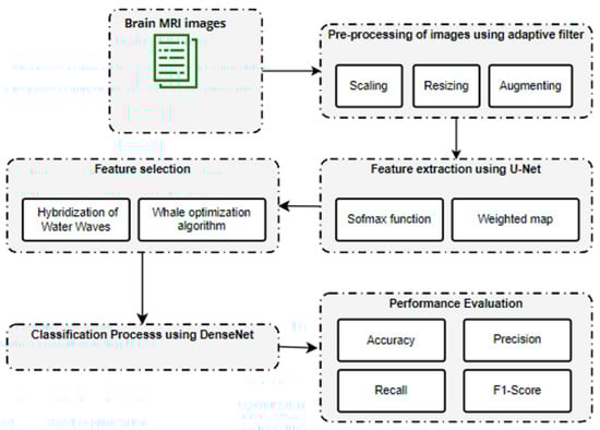 The initial sample consisted of 3064 T1-weighted contrast-enhanced images of brain tumors. These data were pre-processed using an adaptive filter. Consequently, feature extraction was carried out using U-Net. After feature extraction, a hybridization of Water Waves and the Whale Optimization Algorithm was utilized to select a limited set of features. Finally, the tumor region was classified using DenseNet.