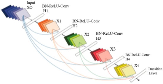 Transition layer: In the DenseNet model, straight links from any layer to all following layers form a distinct connectedness structure with other CNNs, which may further improve the flow of information between levels. The feature maps of all layers before it are given to the l-th layer as a consequence, and the following calculation is performed by Equation (19):