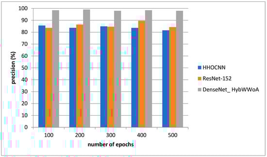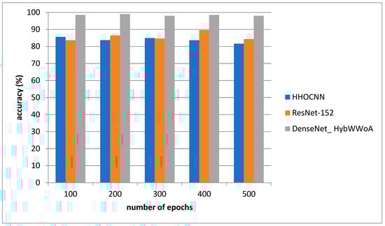 Figure 6 depicts the F1-score evaluation. The comparison is performed between the existing HHOCNN and ResNet-152 with the proposed DenseNet_ HybWWoA. The x-axis and y-axis show the number of epochs and the values obtained as a percentage, respectively. HHOCNN and ResNet-152 achieved 85% and 87% F1-score, respectively, while the proposed DenseNet_ HybWWoA obtained 97% F1-score, which was 12% and 10% superior to HHOCNN and ResNet-152, respectively.