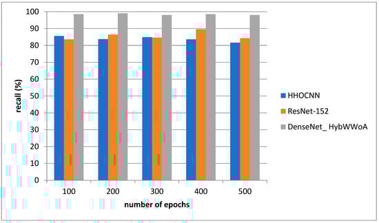 Figure 4 depicts the precision evaluation. The comparison is performed between the existing HHOCNN and ResNet-152 with the proposed DenseNet_ HybWWoA. The x-axis and y-axis show number of epochs and the values obtained as a percentage, respectively. While HHOCNN and ResNet-152 achieved 87.5% and 86% precision, respectively, the proposed DenseNet_ HybWWoA obtained 92.1% precision, which was 7.2% and 6.3% superior to HHOCNN and ResNet-152, respectively. Table 4 shows the performance analysis of recall for severl approaches.