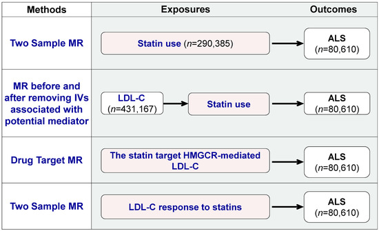 As shown in Figure 1, two-sample MR and drug-target MR were performed to systematically explore the statins’ total effect and LDL-C lowering effect in the periphery on ALS. Two-sample MR is a commonly used MR method, in which the exposure and outcome data are obtained from two separate datasets, typically from summary results provided by the consortia of GWAS [20,24]. Drug-target MR is a variant of MR that can demonstrate the impact of modifying factors (such as circulation LDL-C) through specific therapeutic targets (such as the statin target: HMGCR) on long-term disease outcomes [25,26]. Four MR tests were designed. First, two-sample MR was used to assess the associations between statin use and ALS. Second, we compared the associations between LDL-C and ALS before and after removing SNPs associated with statin use. Third, drug-target MR was applied to reveal the statin target: HMGCR-mediated low-density-lipoprotein cholesterol (LDL-C) and ALS. Fourth, two-sample MR was employed to analyze the relationship between LDL-C response to statins and ALS. The first and second MR tests explored the statins’ total effect and the third and fourth MR tests explored the peripheral LDL-C lowering effect of statins.