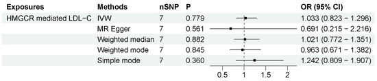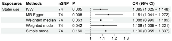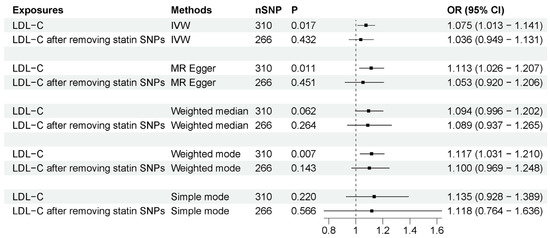 MR studies have identified that LDL-C is also associated with a higher risk of ALS [43,44]. To determine if statin use or LDL-C drives this association, we compared the associations before and after removing SNPs associated with statin use from LDL-C IVs. Before removing these IVs, as previous research indicated, LDL-C is indeed associated with an increased risk of ALS (OR = 1.075, 95% CI = 1.013–1.141, p = 0.017). However, after removing the IVs associated with statin use, the association between LDL-C and ALS was absent (OR = 1.036, 95% CI = 0.949–1.131, p = 0.432). The associations were generally consistent with different sensitivity analysis methods (Figure 3). The MR–Egger intercept analysis did not indicate horizontal pleiotropy (Supplementary Data S1). IVW leave-one-out analysis did not identify any single genetic variant with a high influence (Supplementary Data S2). These results suggest that the association between LDL-C and ALS risk may be potentially mediated by statin use.