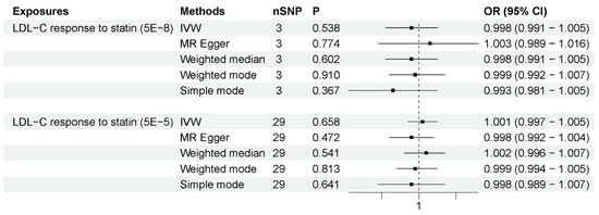 We employed these two methods to specifically explore the peripheral effects of statin use on ALS. (1) HMGCR-mediated peripheral LDL-C was not associated with ALS risk. The number of IVs to proxy HMGCR-mediated peripheral LDL-C was seven. As shown in Figure 4, the IVW method showed that HMGCR-mediated peripheral LDL-C had no association with ALS risk (OR = 1.033, 95% CI = 0.823–1.296, p = 0.779). The results showed that the association was consistent with different sensitivity analysis methods. The MR–Egger intercept analysis did not indicate horizontal pleiotropy (Supplementary Data S1). The leave-one-out analysis did not find a single genetic variant with a high influence (Supplementary Data S2). These data indicated that genetically determined HMGCR-mediated peripheral LDL-C was not associated with an increased risk of ALS. (2) Peripheral LDL-C response to statins was also not associated with an increased risk of ALS. The numbers of IVs to proxy LDL-C response to statin were 3 (p-value < 5 × 10−8) and 29 (p-value < 5 × 10−5). As shown in Figure 5, IVW results show that LDL-C response to statin was not associated with ALS risk (using IVs with p-value < 5 × 10−8: OR = 0.998, 95% CI = 0.991–1.005, p = 0.538; using IVs with p-value < 5 × 10−5: OR = 1.001, 95% CI = 0.997–1.005, p = 0.658). The association was consistent with different sensitivity analysis methods. The MR–Egger intercept analysis did not indicate horizontal pleiotropy (Supplementary Data S1). No single high-influence variant was identified in the leave-one-out analysis (Supplementary Data S2). Thus, circulation LDL-C response to statins was also not associated with ALS risk. In conclusion, the peripheral effects of statins showed no association with an increased risk of ALS, indicating that peripheral LDL-C lowering by statin use has little influence on the motor neurons in the CNS due to the BBB.