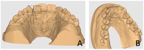 Linear measurements between selected points on sample digital model of the study using the Medit Design app in Medit Link software (Medit corp. 23 Goryeodae-ro 22 gil, Seongbuk-gu, Seoul, Republic of Korea): canine tip, premolar, and molar palatal cusp tip (A); canine, premolars’, and first molars’ more palatal gingival margin points (B).