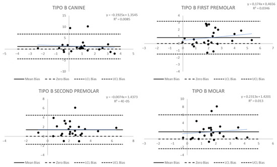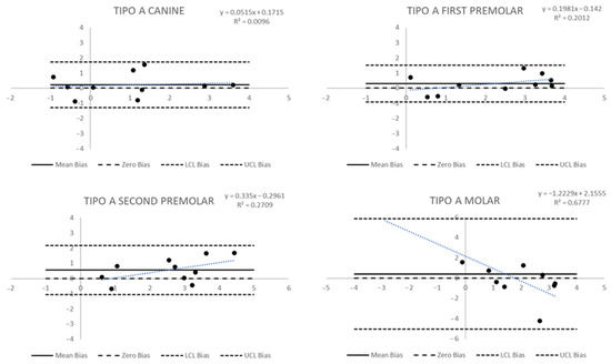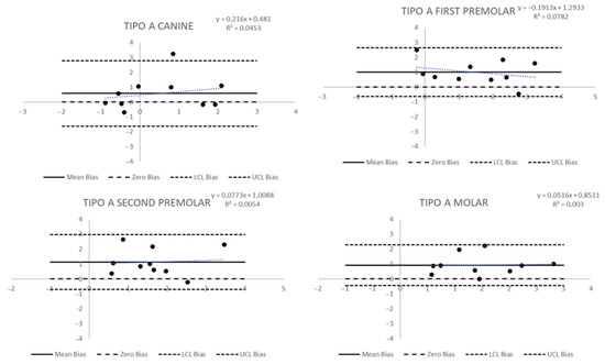 The results for gingival measures (Figure 6) showed more significant mean biases and broader limits. The canine bias (sd) was 1.18 (2.28), and there were two teeth with results outside the limits of agreement; the first premolar, the tooth with the lower bias, had a mean bias (sd) of 0.84 (1.19), and no teeth outside the limits; the second premolar showed a mean bias (sd) of 1.42 mm (1.58) and one tooth outside the limits of agreement; and the molar showed a mean bias of 1.79 (2.15), the largest values of all biases measured, and two teeth outside the limits of agreement. In any case, the trend was statistically significant.