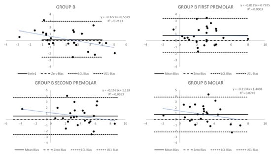 The Bland and Altman graph to evaluate agreement among measures in Group A (Figure 3 and Figure 4) allows for some considerations. Dental measures have shown a mean difference not overlapping the zero bias, especially for the second premolar, whose mean bias (standard deviation—sd) was 0.55 (0.81); the molar measures, instead, have shown a significant standard deviation of 2.78. In the first case, it is possible to observe a significant bias, even if each measure is within the limit of agreement; in the second case, the limits of agreement have a large width, and it appears that data are included in the limits of agreement, but this happens in a wide range. Furthermore, if the relation between the true measure and the bias predicted was analysed in both cases, a linear trend could be seen. For the second premolar, the trend was not statistically significant. In contrast, for the molar tip, the trend was statistically significant with a regression coefficient = −1.22 (p-value = 0.0043), suggesting that the agreement decreases by 1.22 mm for each 1 mm difference between the observed and simulated increases. Other dental measures in Group A did not show particular bias or trends in bias.