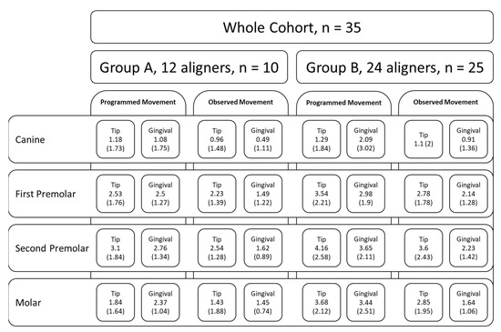 With reasonable doubt, the aligner treatment in Group A (12) and Group B (24) shows a good degree of adherence to the prescription, especially in the dental tip measures. On the other hand, the gingival measures show a higher degree of bias, and the differences were statistically significant. The effects, however, did not differ between the two groups (12 vs. 24). A summary diagram of the study design and average results is shown in Figure 7.