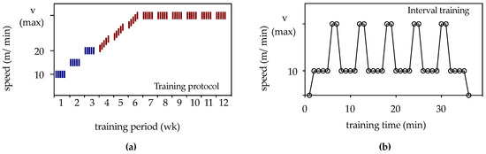 “Training” phase (weeks 7–12): In the remaining 6 weeks, the rats underwent interval training at their respective maximum speeds determined during the “Train to train” phase.
