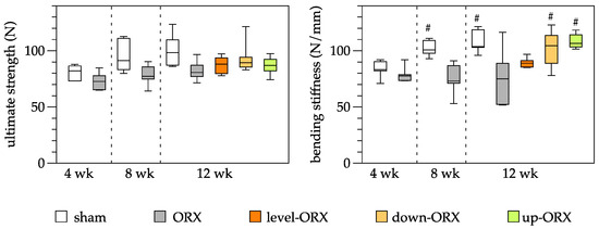 Quantitative analysis of the ultimate strength (N) and the bending stiffness (N/mm) of the tibia. The animals underwent either sham-castration (sham) or castration (ORX), accompanied by level (ORX-level), downhill (ORX-down), or uphill (ORX-up) training for 12 weeks (n = 6 animals per group). The data are presented as box plots (median, 1st, and 3rd quartile) with whiskers (minimum and maximum values). Statistical analysis: one-way ANOVA; # p < 0.05 vs. ORX.