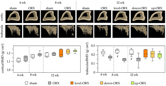 Bone mineral density (g/cm3) of the cortex of the tibia. On the upper side of the figure, representative micro-CT images are displayed. On the bottom side, a quantitative analysis is presented. The animals underwent either sham-castration (sham) or castration (ORX), accompanied by level (ORX-level), downhill (ORX-down), or uphill (ORX-up) training for 12 weeks (n = 6 animals per group). The data are presented as box plots (median, 1st, and 3rd quartile) with whiskers (minimum and maximum values). Statistical analysis: one-way ANOVA; # p < 0.05 vs. ORX.