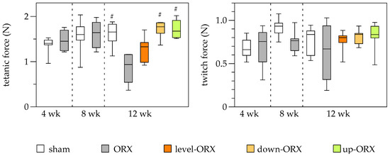 Quantitative analysis of the tetanic force (N) and the twitch force (N) of the soleus muscle. The animals underwent either sham-castration (sham) or castration (ORX), accompanied by level (ORX-level), downhill (ORX-down), or uphill (ORX-up) training for 12 weeks (n = 6 animals per group). The data are presented as box plots (median, 1st, and 3rd quartile) with whiskers (minimum and maximum values). Statistical analysis: one-way ANOVA; # p < 0.05 vs. ORX.