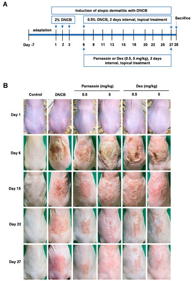 Establishment of a DNCB-induced AD mouse model and the effects of parnassin in the mouse model. (A) Schematic diagram of the experimental design. AD-like skin lesions were induced by treating mice with 2% DNCB for 3 days. One week after induction, topical application of 0.5% DNCB was treated every 2 days along with parnassin and dexamethasone to the lesion site. All mice were euthanized at day 28. (B) Clinical severity of inflammatory skin lesions. Photographs were taken on day 1, 6, 15, 22, and 27.