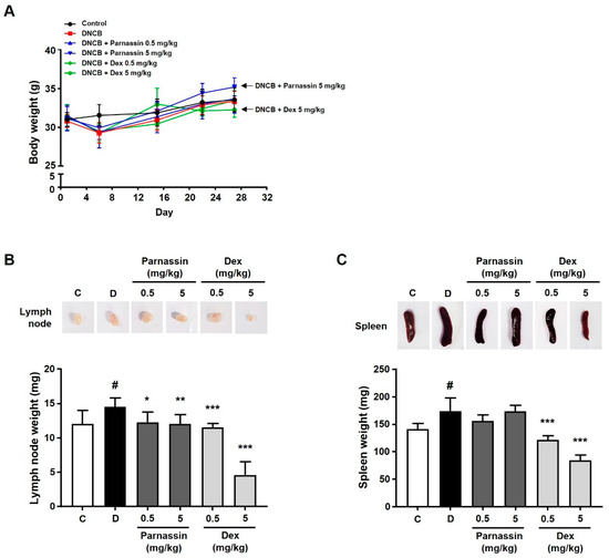 Effect of parnassin on body weight and organ weight of DNCB-induced AD mouse model. (A) Body weights of all mice were measured on day 1, 6, 15, 22, and 27. (B,C) Size comparison of draining lymph node (B) and spleen (C) by photographic images. Spleens and lymph nodes were isolated from all groups on day 28. Spleens and lymph nodes from each group of mice were collected and weighed. The spleen and lymph node weights of each group were represented as a bar diagram. Data are presented as a mean ± SD (# p < 0.05 vs. control group; * p < 0.05, ** p < 0.01, *** p < 0.001 vs. DNCB group).