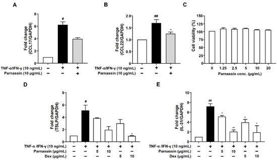 Effect of parnassin on mRNA expression of CCL17, CCL22, TSLP, IL-31 in TNF-α/IFN-γ-stimulated HaCaT cells. (A,B) HaCaT cells were pretreated with 10 μg/mL of peptide for 1 h and stimulated with TNF-α/IFN-γ for 24 h. Total RNA was isolated, and CCL17 and CCL22 mRNA were analyzed by RT-PCR using specific primers. GAPDH was used as the internal control. (C) HaCaT cells were treated with peptide at the indicated concentrations for 24 h. Cell viability was measured by WST assay. (D,E) Total RNA was isolated, and TSLP and IL-31 mRNA levels were analyzed by RT-qPCR using specific primers. The mRNA levels were normalized by GAPDH levels. Data are presented as a mean ± SD of three independent experiments. (# p < 0.05, ## p < 0.01 vs. control; * p < 0.05, ** p < 0.01 vs. TNF-α/IFN-γ-stimulated HaCaT cells).