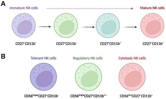 In the liver, NK cells can be divided into two main populations: transient conventional NK (cNK) cells and liver resident NK (lr-NK) cells []. Mouse lr-NK cells are CD49a+DX5−NK cells, while their cNK cells are CD49a−DX5+NK cells []. The phenotype of “memory-like” NK (ml-NK) cells in mice is the same as the phenotype of lr-NK cells or CD49a+DX5−NK cells. Human cNK cells can be subdivided into CD56dimCD16+NK cells and CD56brightCD16−NK cells. In the human liver, CD56dimNK cells and CD56brightNK cells have similar frequencies []. Human liver CD56brightlr-NK cells are CCR5+CXCR6+CD69+NK cells, whereas CD56dimcNK cells lack expression of CD69, CCR5, and CXCR6 []. Human liver ml-NK cells are CXCR6+CD94/NKG2C+ (killer cell lectin-like receptor C2) NK cells []. The maturation of NK cells can be defined for four populations by characterizing the expression of CD11b and CD27 (Figure 1A), including CD11b−CD27−NK cells, CD11b−CD27+NK cells, CD11b+CD27+NK cells, and CD11b+CD27−NK cells [,]. CD11b−CD27−NK cells are immature NK cells with differentiation potential, both CD11b−CD27+NK cells and CD11b+CD27+NK cells have the best ability to secrete cytokines, and CD11b+CD27−NK cells display high cytolytic function []. Human NK cells can also be classified into three functional subsets (Figure 1B): tolerant NK cells (CD56brightCD27−CD11b−), regulatory NK cells (CD56brightCD27+CD11b+/−), and cytotoxic NK cells (CD56dimCD27−CD11b+) [].