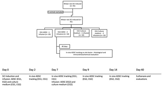 The present study is longitudinal, prospective, randomized, and controlled. It was approved by the Institutional Ethics Committee on the Use of Animals (No. 769) and the Ethics Committee in Research with Humans (CAAE 12723713.3.0000.0020—Universidade Católica do Paraná, Curitiba, Brazil). Three biological samples of adipose tissue donors from bariatric surgery were used. Forty-five Wistar rats, Rattus norvegicus, young adults with an average of 20 weeks of age, weighing between 300 and 350 g, female, were used. During the study period, all animals received water and food ad libitum and were kept under light control (light-dark cycles of 12 h) and at room temperature (25 ± 1 °C, continuous temperature monitoring). Spinal cord injury was induced in all animals (n = 45). They were divided into experimental groups (EG, n = 20) and control groups (CG, n = 20). The experimental group was divided according to the number of infusions performed: one infusion after SCI induction (EG1, n = 10) or two infusions, the second infusion seven days after the injury (EG2, n = 10). Control groups received culture medium infusion (CG1, n = 10 and CG2, n = 10). The animals were followed up for 40 days after SCI and euthanized for histological analysis (Figure 1).