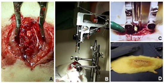 For the induction of standardized experimental SCI, the animals were anesthetized using ketamine (Agener União, São Paulo, Brazil) and 2% xylazine (Agener União, São Paulo, Brazil) intraperitoneally, at a dose of 90 mg/kg and 10 mg/kg weight, respectively. The procedure was started after tests to verify the deep anesthetic plane, absence of corneal reflex, and non-reactivity to caudal compression. Cephalothin 25 mg/kg (Virbac, São Paulo, Brazil) was administered intraperitoneally as preoperative prophylaxis. The animals were positioned in ventral decubitus, on the “Impactor” device (Rutgers University Impactor®, Rutgers, NJ, USA), according to a previously validated method of complete SCI through contusion [19]. Trichotomy was performed, and by palpation of the lower ribs, access to the skin and deep dissection at the level of T10 were accomplished, followed by removal of the posterior vertebral elements (laminectomy), exposing the spinal cord. Under controlled and previously validated adjustments of height and speed, a rod weighing 5 g was dropped on the exposed level, generating a complete lesion proven by the specific software (MASCIS®, Rutgers, NJ, USA) applied to the system for validation of the lesion. Animals that did not have complete SCI were excluded from the study. After SCI induction, hemostasis was performed, and the surgical wound was washed with 0.9% saline solution, and then the skin was sutured with mono nylon 3.0 thread (Shalom, Goiania, Brazil) (Figure 2). All animals remained under anesthesia for approximately two hours in a chamber with a controlled temperature of 30 °C and placed in individual cages with easily accessible food and water. The surgical wound was inspected daily, and the bladder was emptied using the Credé method every 12 h in all animals throughout the postoperative period [20].