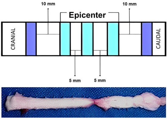 After euthanasia, the spinal cord was collected and transferred to a 10% formalin buffered solution. After fixation, histological sections were made, with a thickness of 5 µm from the central area of the lesion. Evident morphological changes were verified macroscopically, evidencing opaque and darker coloration, as well as local thinning, in correspondence with the experimentally induced SCI level (Figure 3).