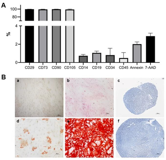 Adipose-derived stem cell characterization. (A). Immunophenotypical profile, cell viability, and apoptosis/necrosis. The bars represent the average expression for each marker. (B). Adipose-derived stem cell differentiation. Cells were maintained with medium to induce differentiation for 21 days. (d). Adipose differentiation was demonstrated with the presence of lipid vacuoles. (e). Extracellular matrix mineralization was observed at osteogenic differentiation. (f). Chondrocytic differentiation was observed by proteoglycan deposition in the matrix and the presence of lacunae around young chondrocytes. (a–c). Control cells were cultured without an induction medium.