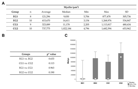 Histomorphometric analysis of myelin area. (A,B). Comparison of myelin area showed no significant difference between groups. (C). Myelin was measured in units of µm2 and represented by the median values. * Mann-Whitney non-parametric test, p < 0.012 (Bonferroni’s correction). EG: experimental group; CG: control group; SD: standard deviation.