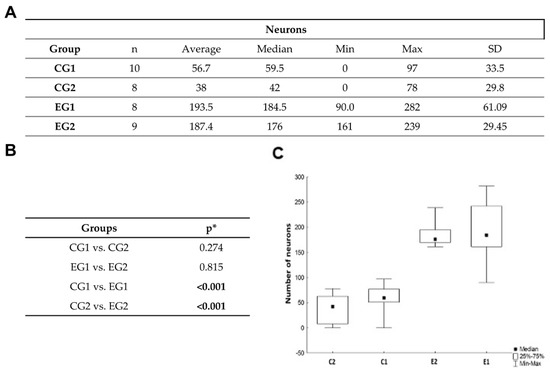 (A) Histomorphometric analysis of neurons. (B,C) Comparison of neuron numbers between experimental and control groups. Groups that received ADSC infusion, showed a greater number of neurons. * Mann-Whitney’s non-parametric test, p < 0.012 (Bonferroni’s correction). EG: experimental group; CG: control group; SD: standard deviation. Numbers in bold represent statistically significant difference.