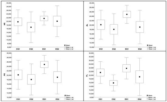 Description of astrocytic area in four quadrants. Astrocytes were measured in units of µm2. Analysis of variance with one factor (ANOVA), p < 0.05—EG: experimental group; CG: control group; AR: anterior-right; AL: anterior-left; PR: posterior-right; PL: posterior-left.