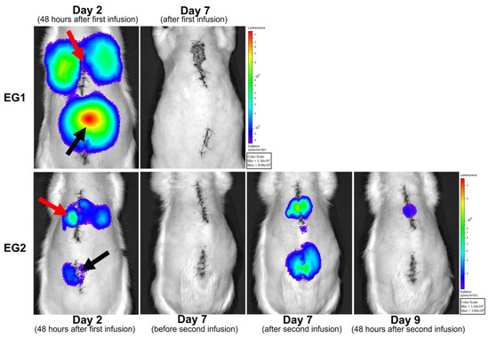 In vivo tracking of ADSC. Representative photos of experimental groups (EG1 and EG2). Cells were observed at the infusion site and in the lungs. The red arrow indicates the injury site, and the black arrow indicates the ADSC infusion site. The images are pseudo-colored and represent the bioluminescent signal emitted during degradation of D-luciferin by the enzyme luciferase present in cells. The color scale represents the intensity of the bioluminescence signal emitted by the cells in photons/second/cm2/steradian (p/s/cm2/sr).