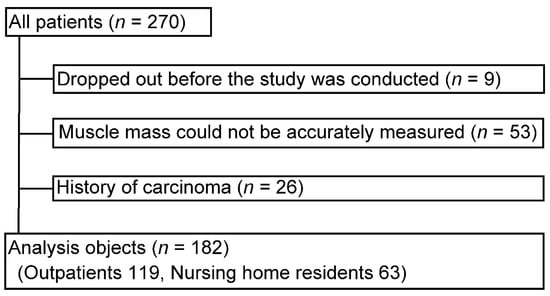 A total of 270 patients were included; 9 were excluded because they either died or were transferred to another hospital before the study began. We could not accurately measure the muscle mass of 53 patients because they were unable to maintain the desired position. In addition, after excluding 26 patients with a confirmed history of cancer, 182 patients were included in the analysis. One-hundred and nineteen patients were hospital outpatients, and sixty-three were nursing home residents (Figure 1).