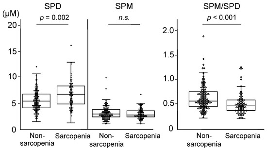 SPD and SPM concentrations and the SPM/SPD ratios were compared between the sarcopenia and non-sarcopenia groups (Figure 2). The SPD concentration was significantly higher in the sarcopenia group than in the non-sarcopenia group (p = 0.002), and the SPM/SPD ratio was significantly lower in the sarcopenia group than in the non-sarcopenia group (p < 0.001). In addition, SPM concentrations were not significantly different between the sarcopenia and non-sarcopenia groups (p = 0.701).