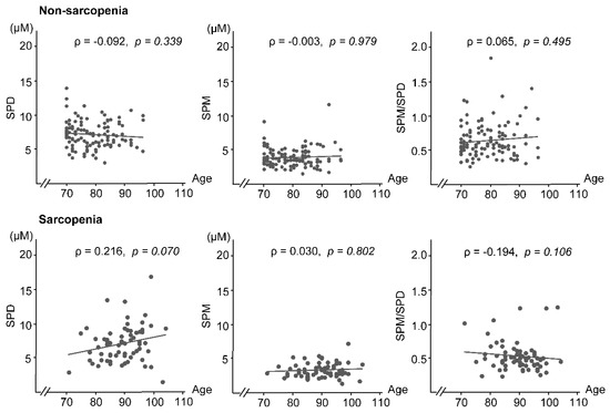In the sarcopenia group, there was a positive correlation between age and the SPD concentration, and a negative correlation between age and the SPM/SPD ratio; however, both correlations were not statistically significant. Spearman’s rank correlation coefficient (ρ) was used. SPD—spermidine; SPM—spermine.