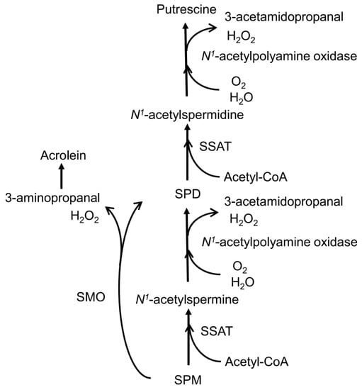 Inflammation-induced enzyme activation for polyamine catabolism and the production of byproducts. Substances that provoke inflammation also activate SSAT and SMO. SMO does not act on spermidine but rather degrades spermine to produce substances with strong cytotoxic activity, such as acrolein. SMO—spermine oxidase; Acetyl-CoA—acetyl coenzyme A; SSAT—spermidine/spermine-N1-acetyltransferase; SPM—spermine; SPD—spermidine.