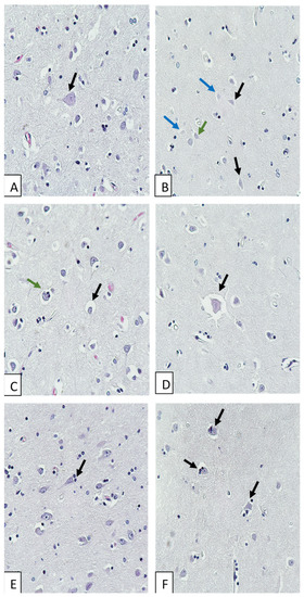 Morphological changes in the cerebral cortex of COVID-19 non-survivors. Hematoxylin and eosin staining. Magnification, ×400. (A) Neuronal swelling. (B) Ghost cells (shown by blue arrows), hypochromic neurons (shown by black arrows), and karyolysis (green arrow). (C) Pericellular edema (shown by black arrow); neuronophagia (shown by green arrow). (D) Severe pericellular edema. (E) Sattelitosis. (F) Neuronophagia.