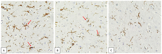 When stained for Iba-1, microglial cells were visualized in all specimens. Visible differences in the intensity of microglial staining in the specimens were noted. Some microglial cells were in close contact with neurons (Figure 3).