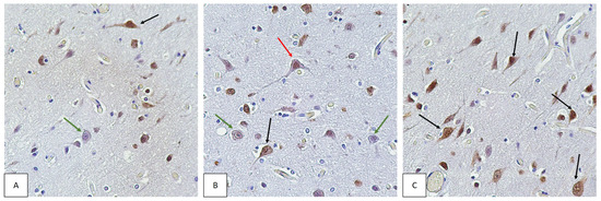 Cerebral cortex of COVID-19 non-survivors. IHC staining for the neuronal marker NeuN. Magnification, ×400. Different localization of NeuN in the neuron. NeuN localized in the neuronal nucleus is indicated by red arrows (B). NeuN localized in the nucleus and cytoplasm of neurons is indicated by black arrows (A–C). Neurons not stained for NeuN are indicated by green arrows (A,B).