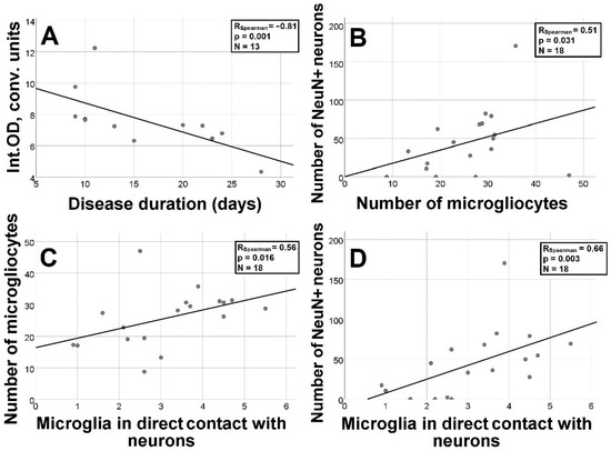 Graphs characterizing the relationship between the integral density of microgliocytes stained for Iba-1 and disease duration (A); the number of microgliocytes and the number of NeuN+ neurons (B) and the number of microgliocytes in contact with neurons (C); and the number of NeuN+ neurons with the number of microglial cells in contact with neurons (D).