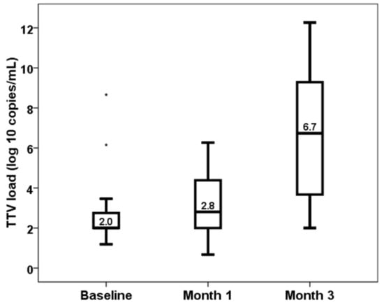Median TTV load values increased from pretransplant (2.00, IQR 0.76) to month 1 (2.81, IQR 2.41, p < 0.001) and month 3 (6.73, IQR 5.74, p < 0.001) (Figure 1). Baseline TTV load did not relate to recipient age (rho = 0.177, p = 0.200), to donor age (rho = 0.108, p = 0.435) and to time in renal replacement therapy (rho = 0.091, p = 0.513) according to Spearman correlation analysis. Baseline TTV load was significantly higher in male recipients (median 2.00, IQR 0 vs. median 2.47, IQR 0.98, Mann–Whitney p = 0.019). Neither CMV serostatus (median 2.00, IQR 0.87 vs. median 2.00, IQR 0.75, Mann–Whitney p = 0.453) nor preemptive transplant (median 2.19, IQR 0.75 vs. median 2.00, IQR 0.77, Mann–Whitney p = 0.171) showed significantly different baseline TTV loads.