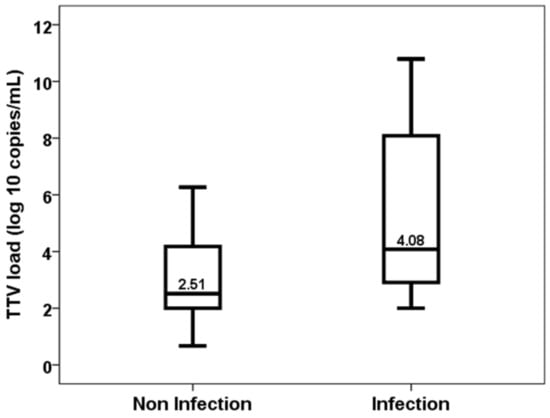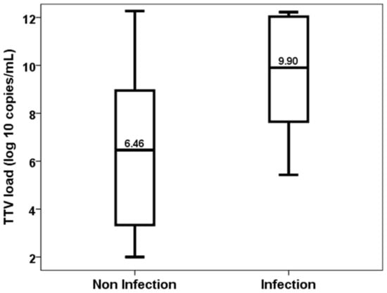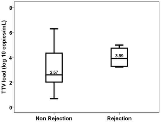 Due to the low number of rejection episodes in our study, we did not find a relationship with TTV load, although the median differences between patients with (3.89 log) and without rejection (2.57 log) were striking. Most previous studies have found that patients with lower TTV loads are at a higher risk of acute rejection [,,,,,,,], antibody-mediated rejection [] and subclinical rejection []. TTV load has a discriminative ability for predicting acute rejection with AUC-ROC ranging from 0.73 to 0.82 [,,]. Collecting data from 15 studies, the meta-analysis by Van Rijn et al. concluded that the risk of rejection decreased by 10% per 1 log of TTV load []. The fact that rejection can be diagnosed in a more homogeneous way than infection thanks to the Banff consensus among the different centers could facilitate more concordant results in the different studies.