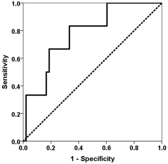 Similarly, patients who developed an opportunistic infection between months 3 and 6 showed higher levels of TTV load at the third month (6.46, IQR 5.74 vs. 9.90, IQR 4.99, p = 0.026) (Figure 4). TTV load at the third month discriminated those patients at risk of developing opportunistic infections from months 3 to 6 (AUC-ROC 0.778, 95%CI 0.599–0.957, p = 0.028) (Figure 5). TTV load at month 3 related to a higher risk of an opportunistic infection from months 3 to 6 (OR 1.444, 95%CI 1.017–2.050, p = 0.040) and this relationship remained significant (OR 1.444, 95%CI 1.017–2.050, p = 0.040) after adjusting by confounders variables such as recipient age, donor age, female recipient gender, estimated GFR and diabetes mellitus.