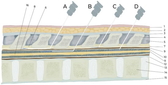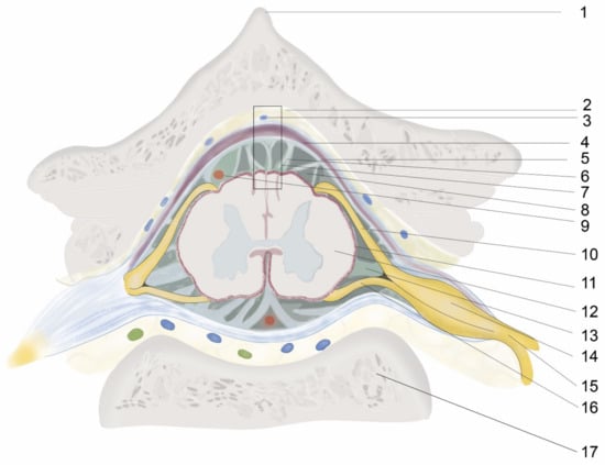 - Macpherson, D.; Quondamatteo, F.; Broom, M. Update on applied epidural anatomy. BJA Educ. 2022, 22, 182–189. [Google Scholar] [CrossRef] [PubMed]