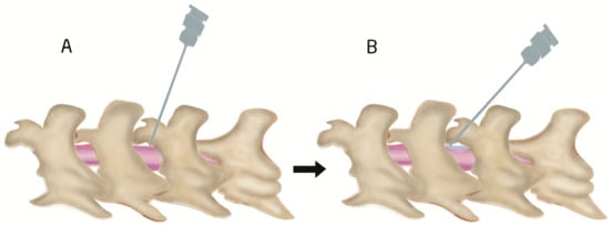 After administering anesthesia (e.g., volatile isoflurane), the thoracolumbar region is shaved. Needles are inserted through the intervertebral space where bony parts are absent, which is covered by the ligamentum flavum []. The angle of needle insertion varies but has been reported at over 20° [,,,], 45° [,], at 45° shown in videos but reported to be 70–80° in the discussion section [], and at 70–80° shown in videos [] in mice; an angle of 15–30° has been reported in rats []. Therefore, it is difficult to conclude what the optimal injection angle is (Figure 3 and Figure 4). However, the authors of the current review also insert needles at angles of 70–80° and then reduce the angle to 30–45° during drug injection to easily spread out the injected drug from a narrow needle and to prevent CSF leakage during needle withdrawal (Figure 4). During insertion, when the tip of the needle reaches the bottom of the spinal canal (upper part of the vertebral body), the needle should not be pushed further as it may penetrate the intervertebral disc into the abdominal cavity [] (Figure 1 and Figure 3). The depth of needle insertion has been reported to be approximately 0.30 cm in rats after skin and muscle incision and 0.30–0.40 cm without skin and muscle incision in mice [].